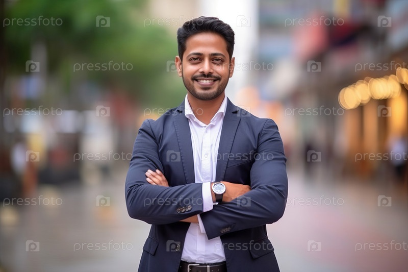 Портрет молодого улыбающегося профессионального индийского бизнесмена, уверенного в себе позитива, стоящего на улице, скрестив руки, глядя в камеру