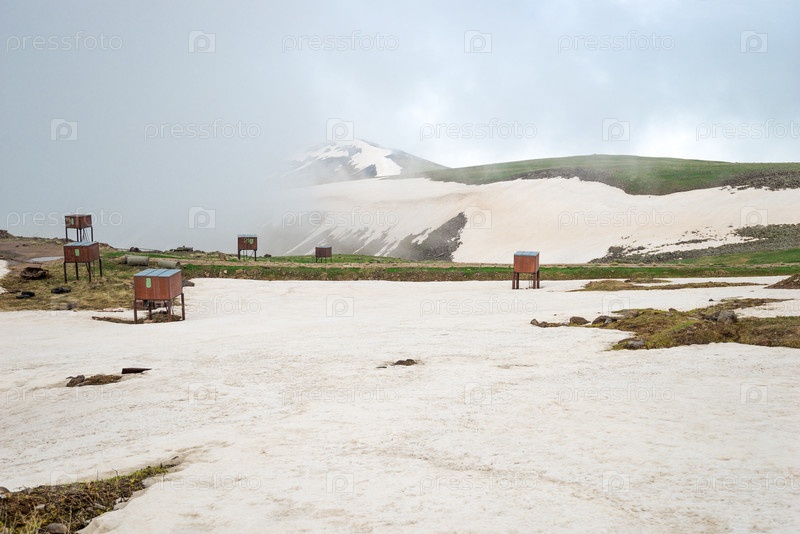 Научная станция высоко в горах Армении летом, до сих пор идет снег