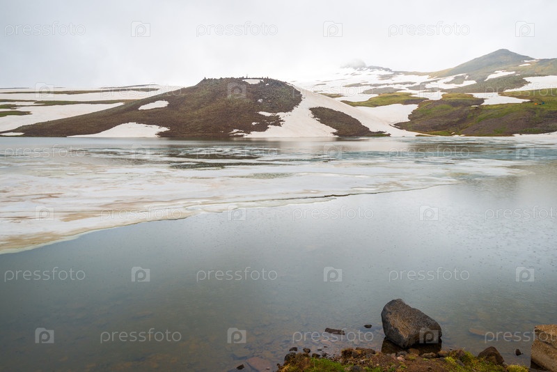 Замороженное озеро Кари высоко в горах Армении летом
