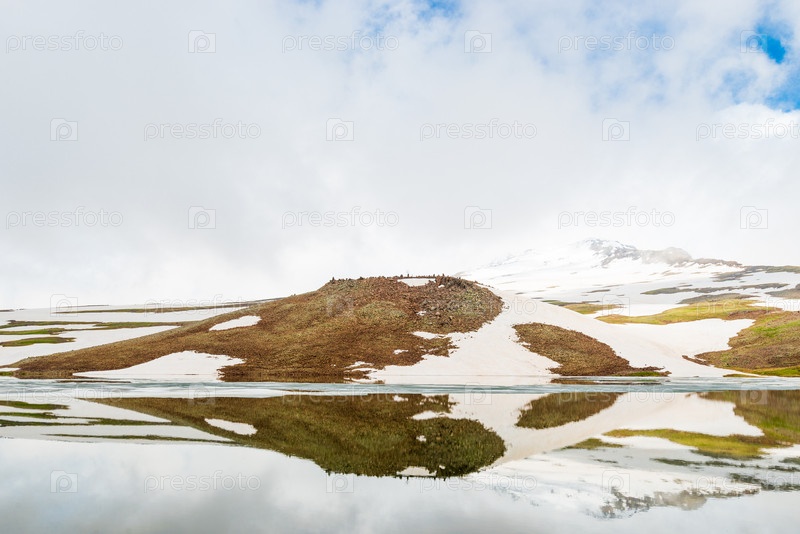 Сценический вид на замерзшее озеро Кари высоко в горах Армении летом