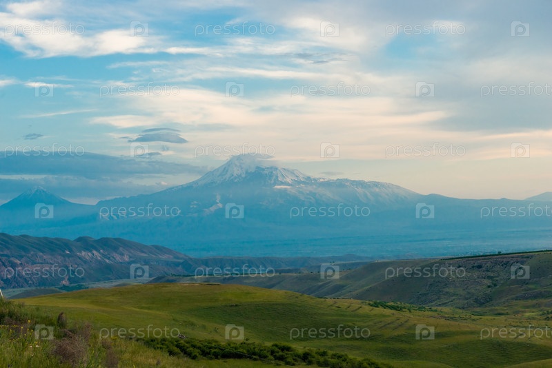 Красивый живописный вечерний пейзаж Армении - гора Большой Арарат с заснеженной вершиной