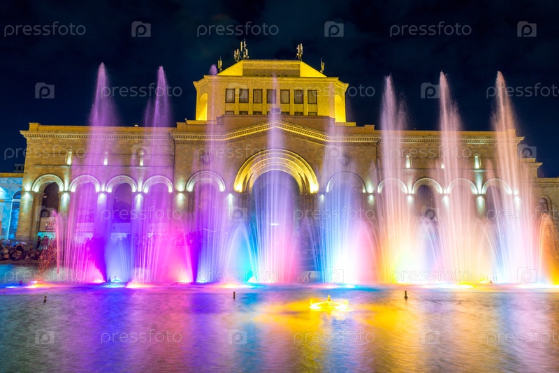 Фонтан при Правительстве Республики Армения ночью расположен на площади Республики в Ереване, Армения