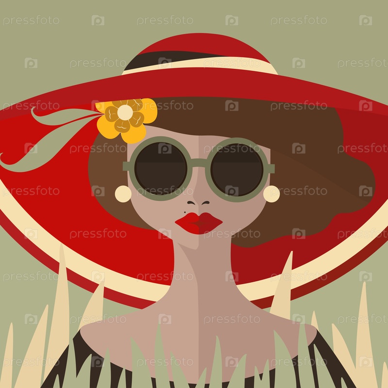 Ироничный векторный портрет молодой женщины в современных солнцезащитных очках и красной шляпе