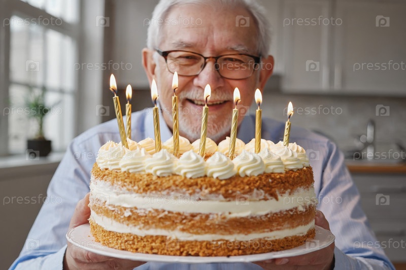 Взрослый мужчина задувает свечи на торте и празднует день рождения