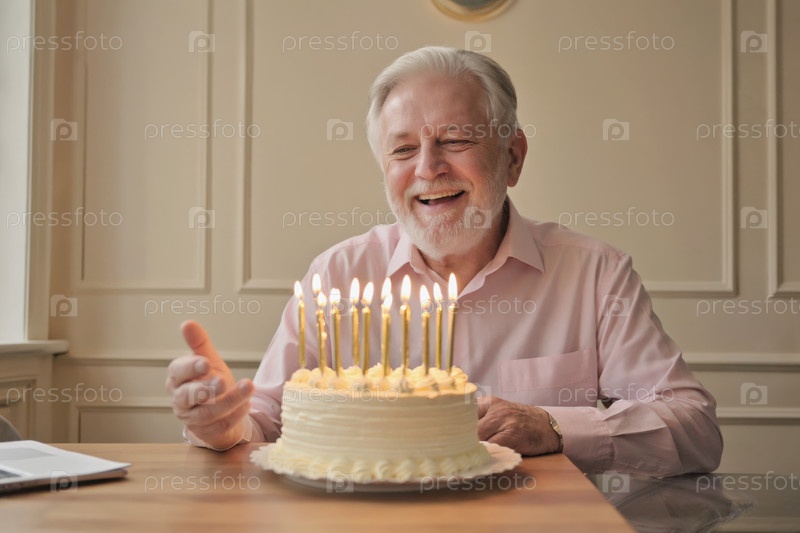 Взрослый мужчина задувает свечи на торте и празднует день рождения
