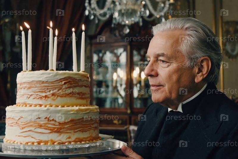 Взрослый мужчина задувает свечи на торте и празднует день рождения