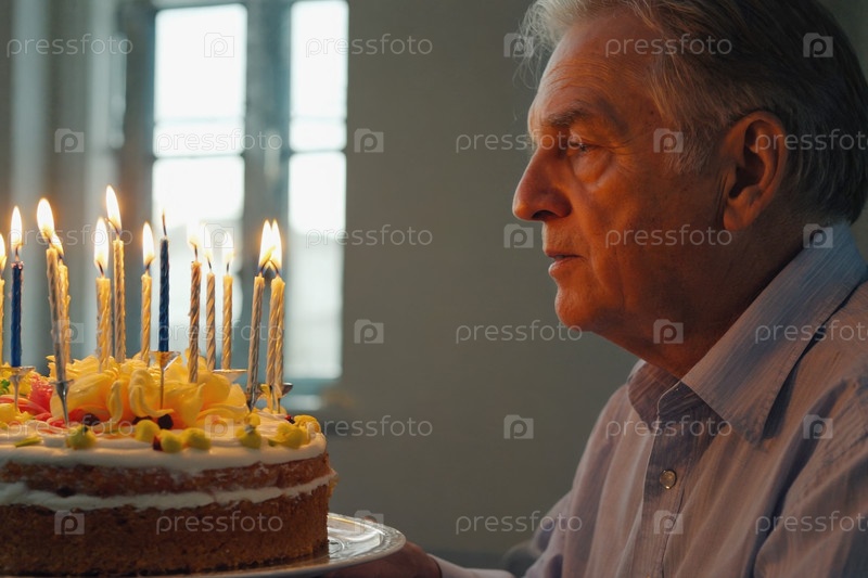 Взрослый мужчина задувает свечи на торте и празднует день рождения