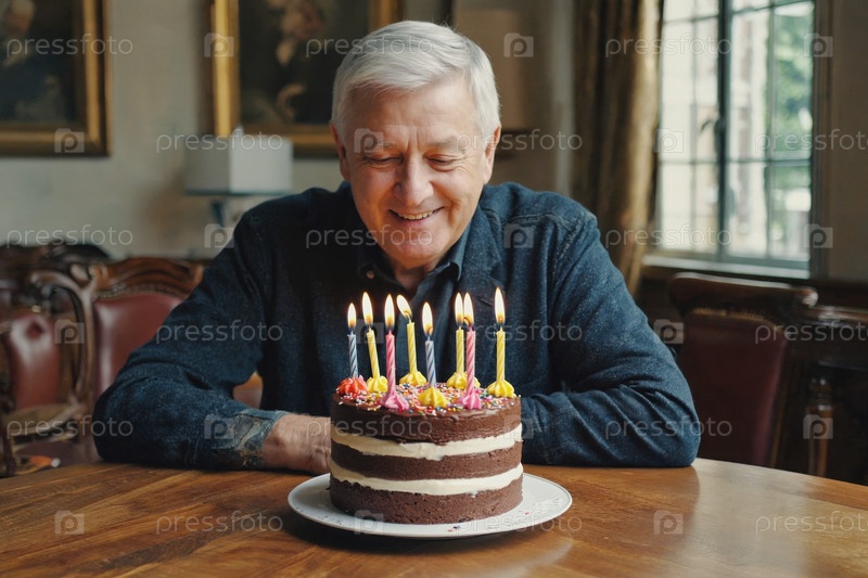 Взрослый мужчина задувает свечи на торте и празднует день рождения