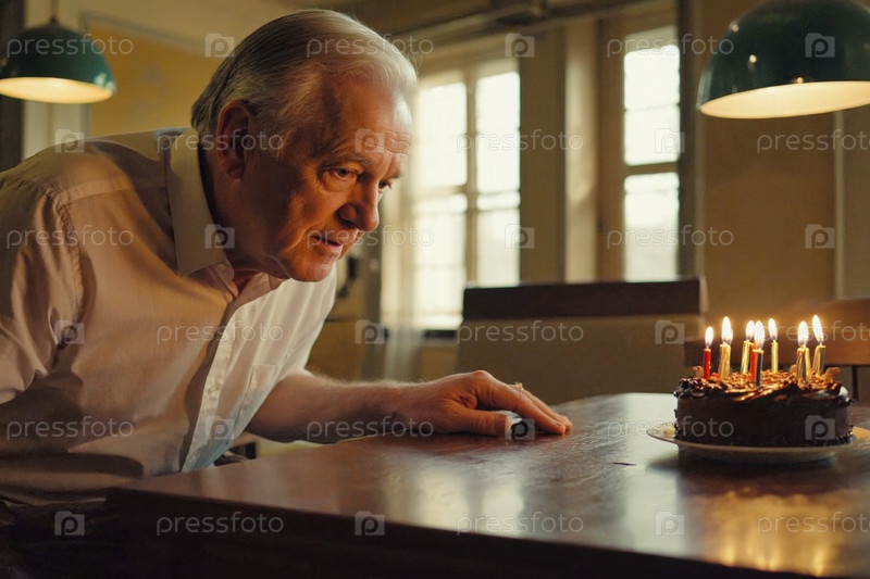 Взрослый мужчина задувает свечи на торте и празднует день рождения