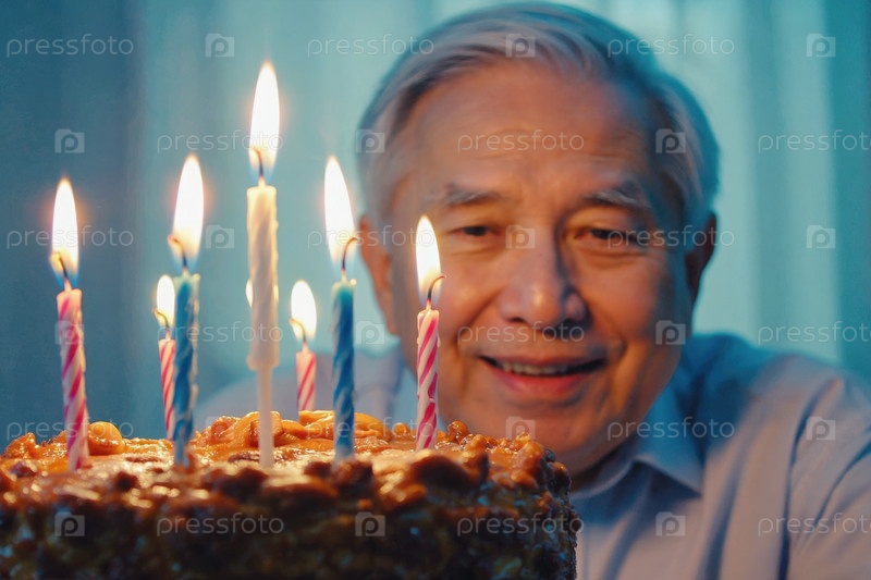 Взрослый мужчина задувает свечи на торте и празднует день рождения