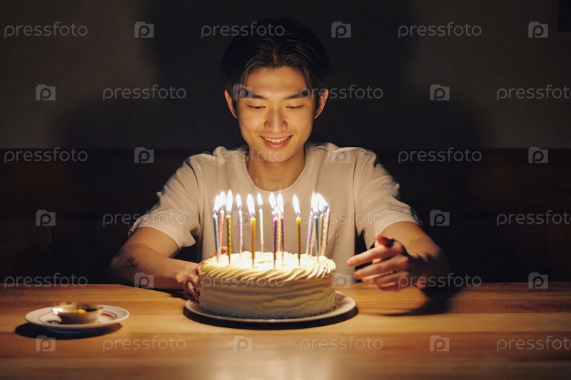 Молодой человек задувает свечи на торте, празднование дня рождения