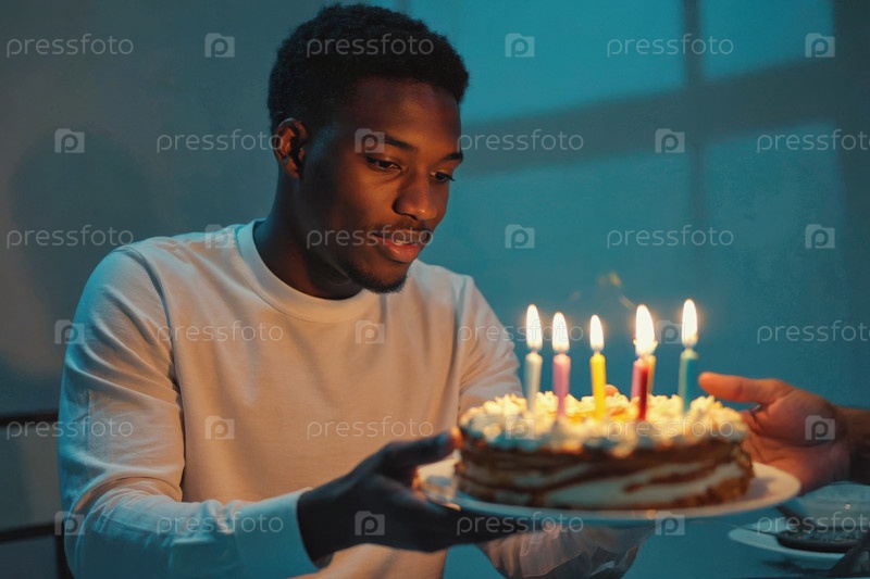 Молодой человек задувает свечи на торте, празднование дня рождения