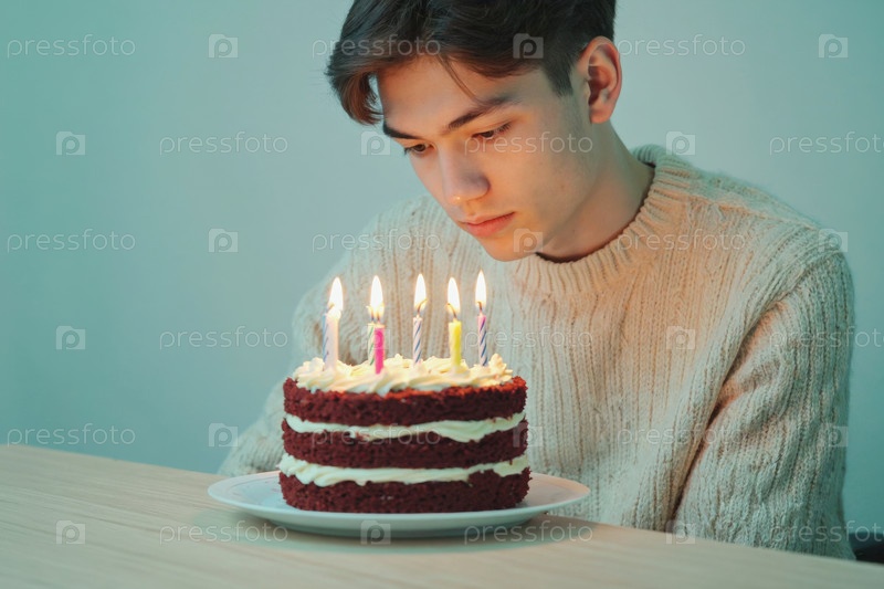 Молодой человек задувает свечи на торте, празднование дня рождения