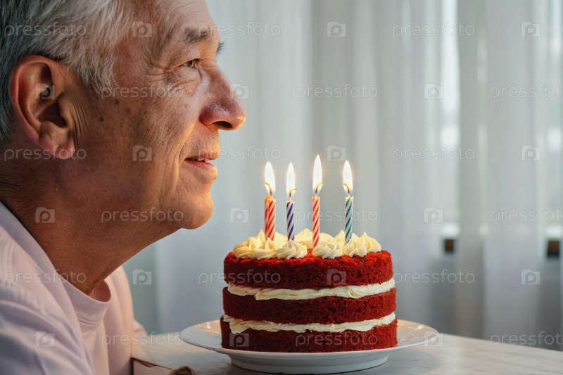Взрослый мужчина задувает свечи на торте и празднует день рождения