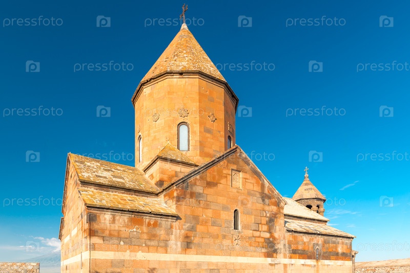 Монастырская архитектура Хор Вирап крупным планом на фоне голубого неба, достопримечательность Армении