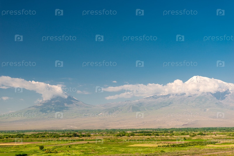 Зеленое поле и высокая гора Арарат против голубого неба в солнечный день, Армения