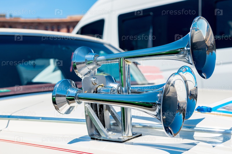 Вид крупным планом хромированного рога на капоте автомобиля