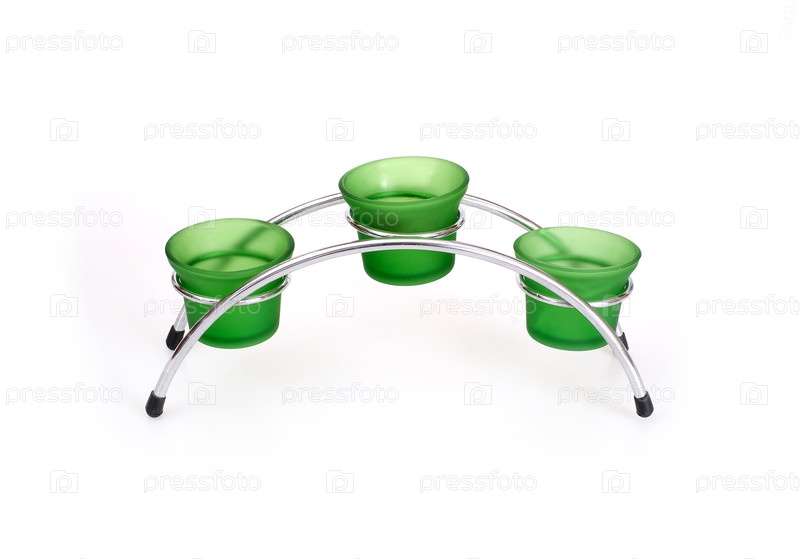 Металлический подсвечник с зелеными стеклянными чашками, изолированными на белом фоне