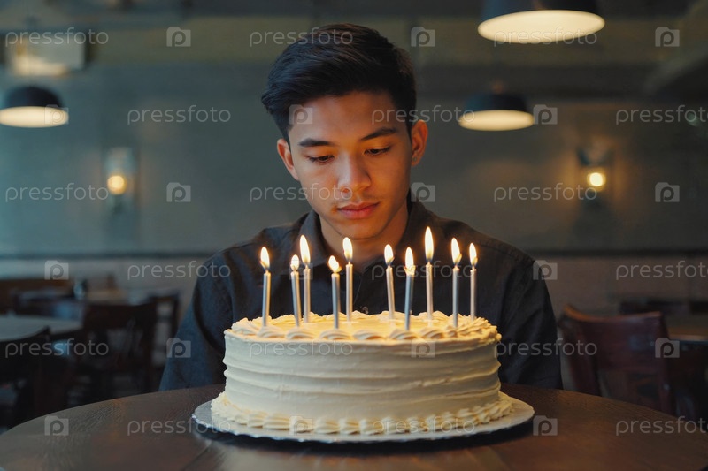 Молодой человек задувает свечи на торте, празднование дня рождения