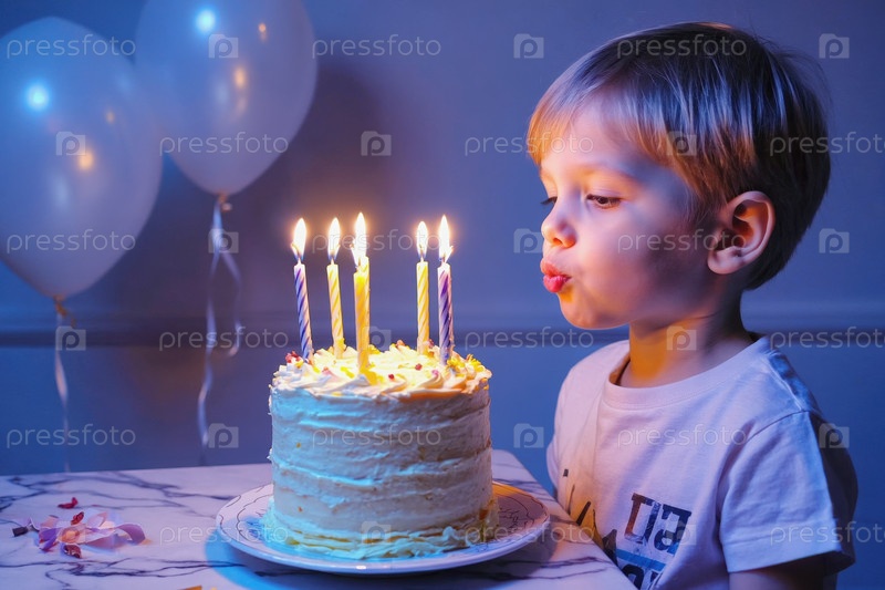 Маленький мальчик задувает свечи на торте, празднование дня рождения детей