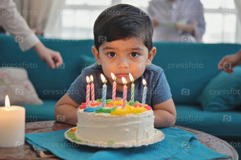 Маленький мальчик задувает свечи на торте, празднование дня рождения детей
