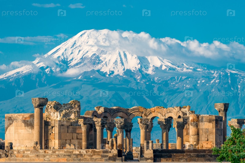 Высокий снежный Арарат и руины храма Звартноц - достопримечательность Армении