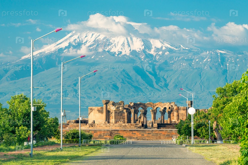 Армянская достопримечательность - Руины храма Звартноц на фоне Высокого Арарата