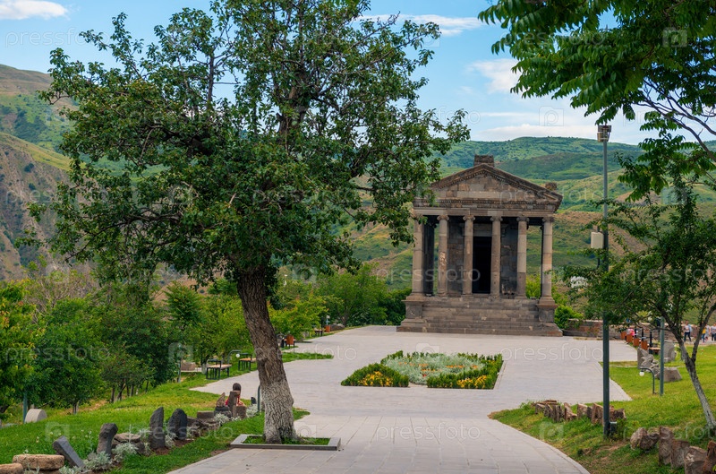 Языческий древний храм Гарни на фоне зеленых гор, известная достопримечательность Армении