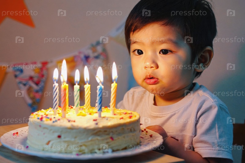 Маленький мальчик задувает свечи на торте, празднование дня рождения детей