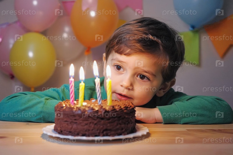 Маленький мальчик задувает свечи на торте, празднование дня рождения детей