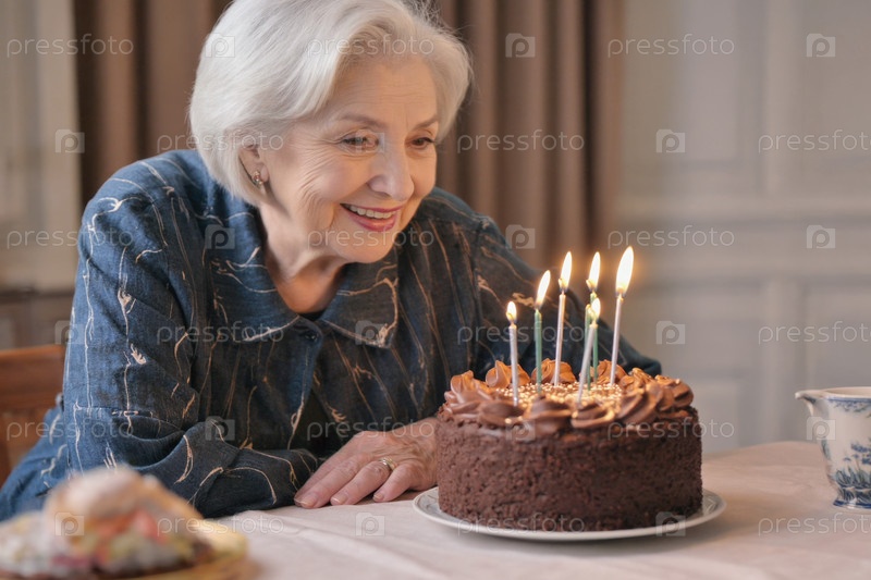 Взрослая женщина задувает свечи на торте, празднование дня рождения
