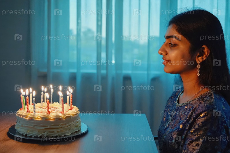 Генеративная молодая женщина задувает свечи на торте и празднует день рождения