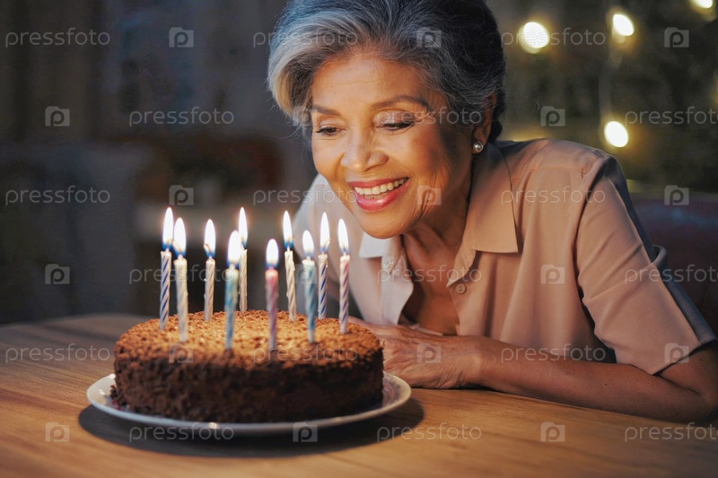 Взрослая женщина задувает свечи на торте, празднование дня рождения
