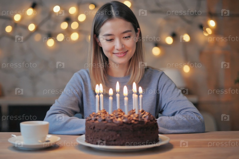 Генеративная молодая женщина задувает свечи на торте и празднует день рождения