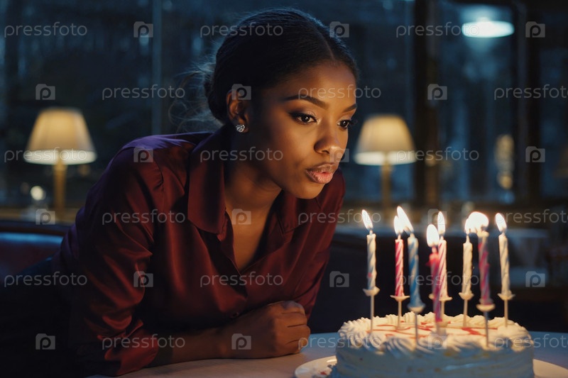 Генеративная молодая женщина задувает свечи на торте и празднует день рождения