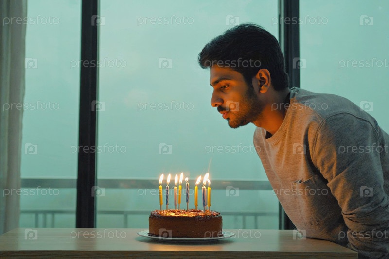 Молодой человек задувает свечи на торте, празднование дня рождения
