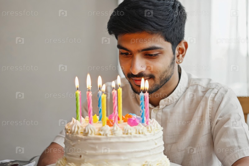 Молодой человек задувает свечи на торте, празднование дня рождения