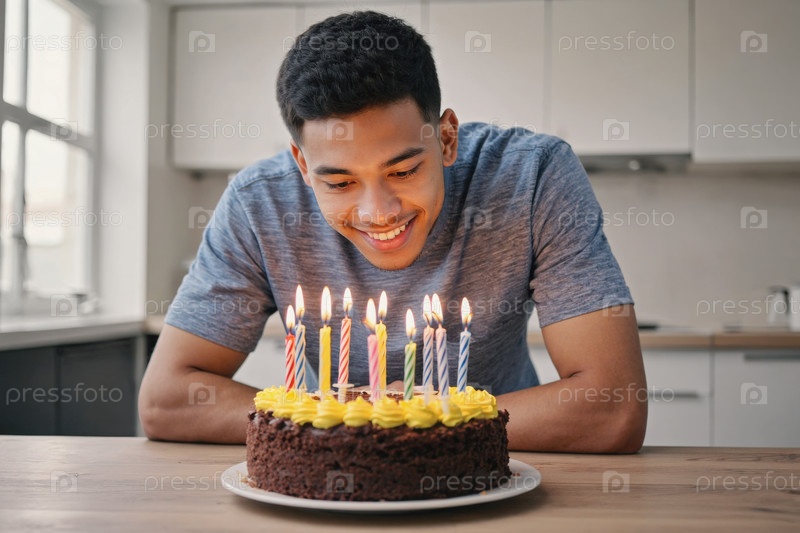 Молодой человек задувает свечи на торте, празднование дня рождения