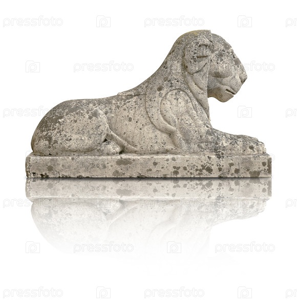 Статуя каменного льва изолирована на белом фоне. Элемент дизайна с обрезкой пути