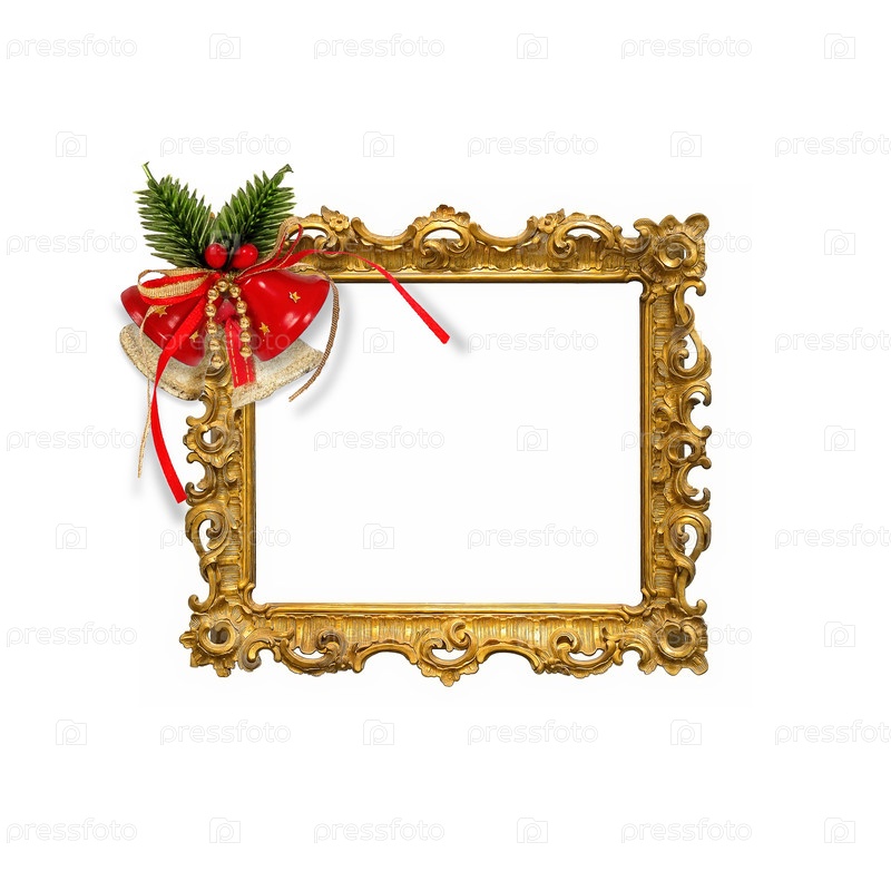 Золотая рама с рождественскими декоративными колоколами изолирована на белом фоне