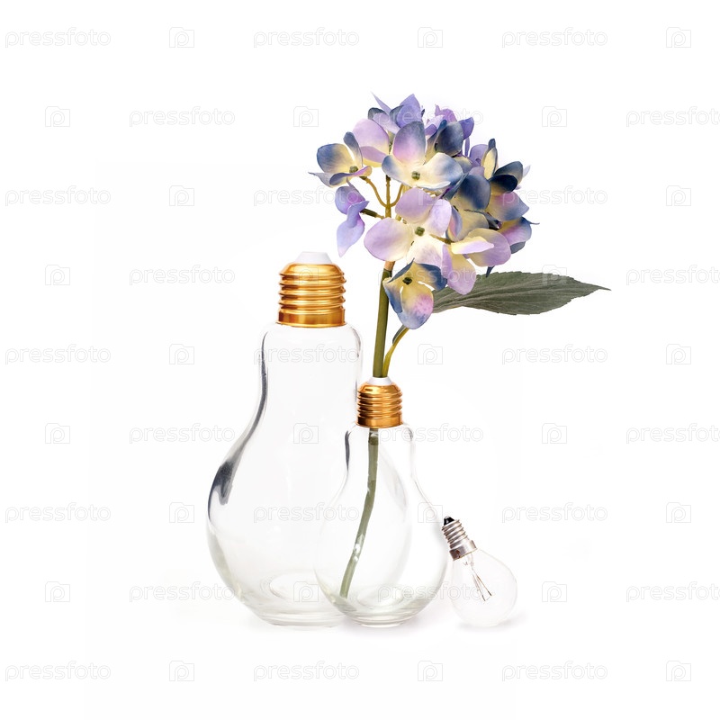 Стеклянная ваза с гортензией в виде лампочки, изолированной на белом фоне