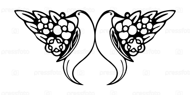 Векторный черно-белый цветочный картуш (композиция) с двумя птичками. Изолировано на белом фоне