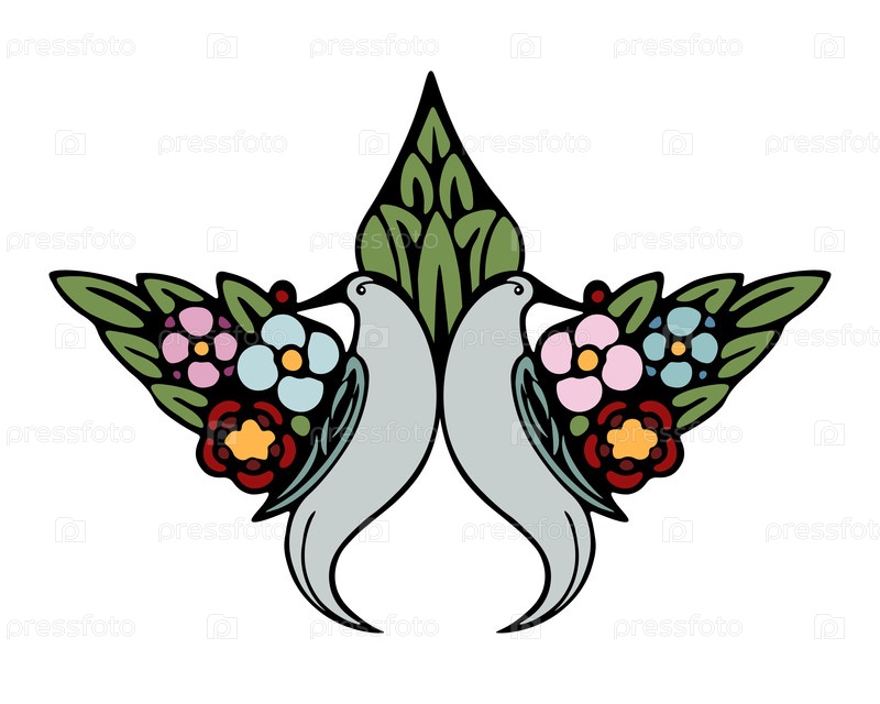 Векторный цветной картуш (композиция) с цветами и двумя птичками. Изолировано на белом фоне