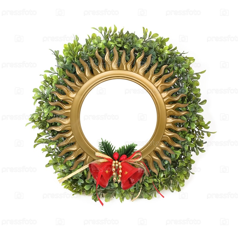 Золотая рама с рождественским декоративным зеленым венком изолирована на белом фоне