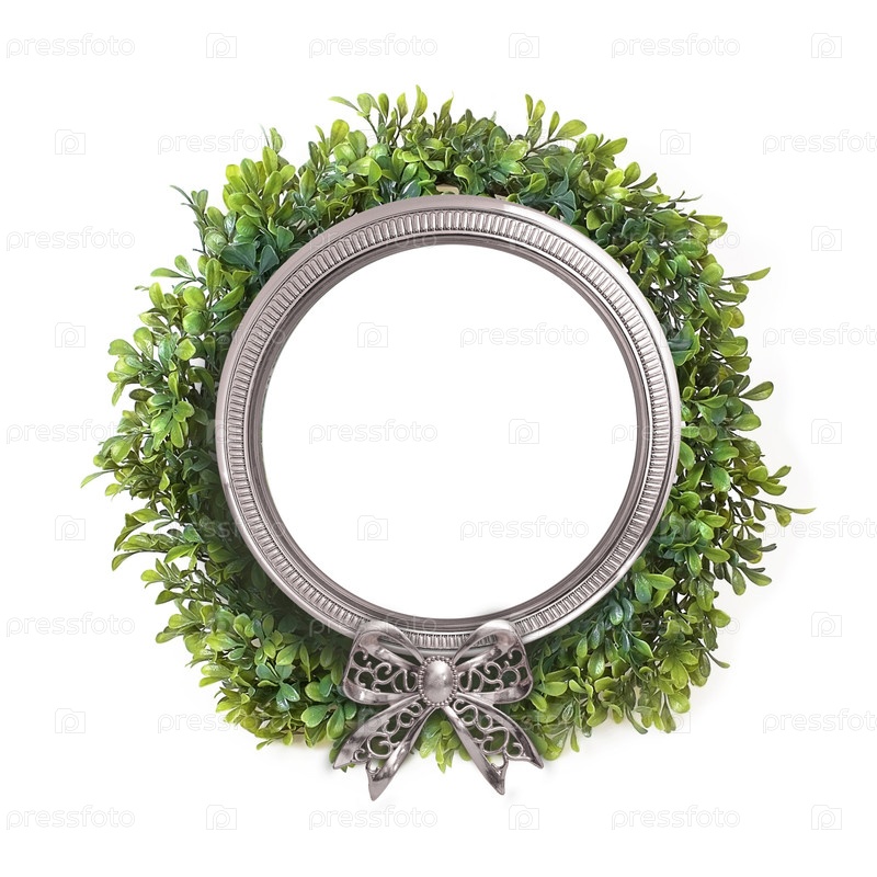 Серебряный каркас с рождественским декоративным зеленым венком изолирован на белом фоне