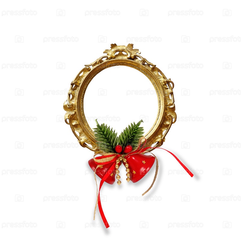 Золотая рама с рождественскими декоративными колоколами изолирована на белом фоне