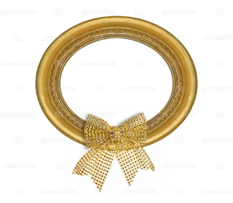 Золотая рама с рождественским декоративным луком изолирована на белом фоне