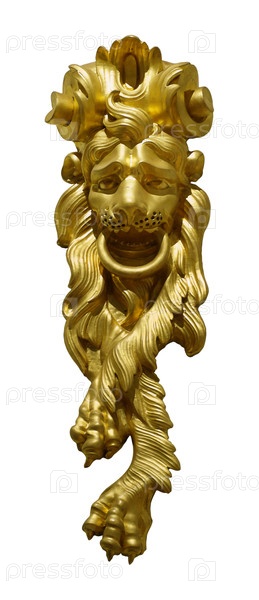 Декоративный элемент в виде золотой львиной головы выделен на белом фоне. Элемент дизайна с обрезкой пути