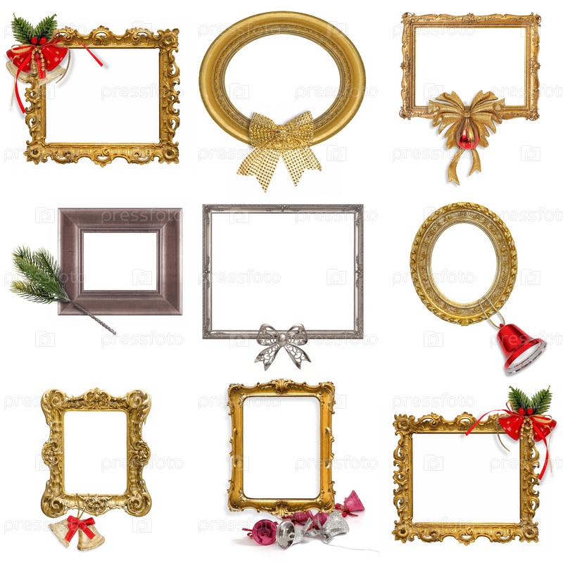 Набор золотых и серебряных рам с рождественским декором, изолированным на белом фоне