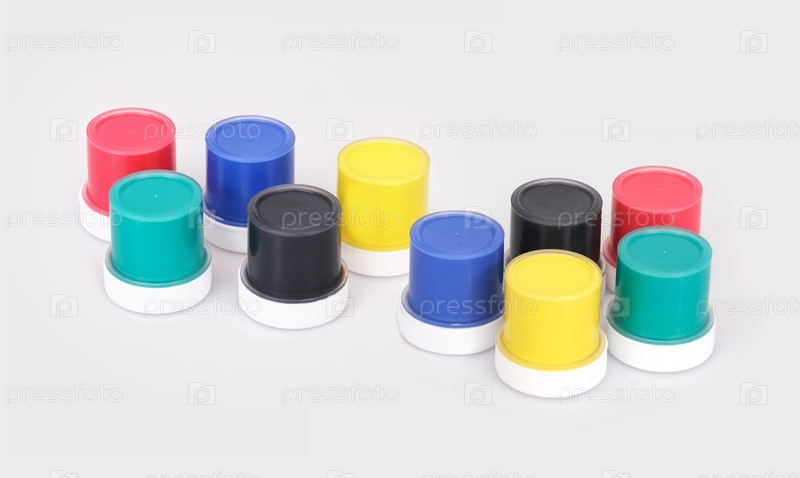 Бутылки с разноцветными гуашью изолированы на белом фоне